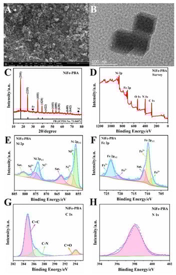 (A) SEM image, (B) TEM image, and (C) XRD image of NiFe-PBA. XPS spectra of NiFe-PBA: (D) full spectrum of XPS detection of NiFe-PBA; (E) Ni 2p spectrum, (F) Fe 2p spectrum, (G) C 1s spectrum, and (H) N 1s spectrum from the XPS detection of NiFe-PBA.