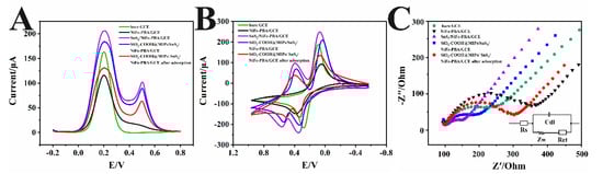 (A) DPV, (B) CV, and (C) EIS curves of electrode surfaces modified with different materials. Electrochemical measurements were performed in solutions containing 5 mmol/L[Fe(CN)6]3−/4− and 0.1 mol/L KCl.