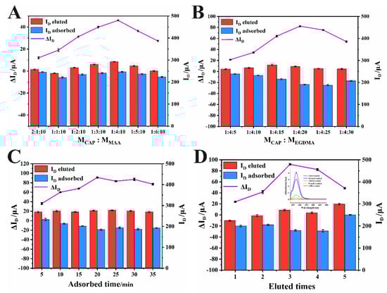 The elution times were also one of parameters that needed to be optimized for the sensor because the number of imprinted cavities with specific recognition target molecules was directly affected by the elution times. According to the UV absorption spectrum of the eluate in Figure 3D (inset), the UV absorption peak (278 nm) of CAP in the fifth eluate was close to zero, indicating that the template molecule CAP could be completely removed after five elution phases. However, combined with the statistical graph in Figure 3D, the ΔID reached the maximum value in the third elution phase. When the elution continued, the ΔID showed a significant downward trend. This might have been because the excessive number of elution phases reduced the imprinted cavity, which could specifically recognize the target molecule, by disrupting the 3D imprinted structure of the MIPs. Therefore, three elution phases was selected as the optimal number.