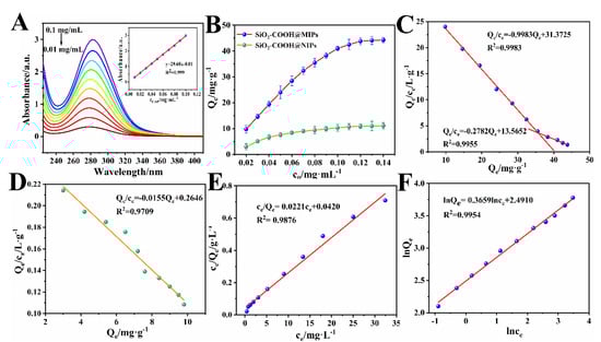 The adsorption behavior of the SiO2-COOH@MIPs was further analyzed using Langmuir and Freundlich isothermal models (Figure 4E,F), where the Langmuir model was suitable for monolayer adsorption and the Freundlich model was suitable for multilayer adsorption. The data obtained from the fitting calculation are recorded in Table S2. The Langmuir formula and the Freundlich formula are as follows [32]:
