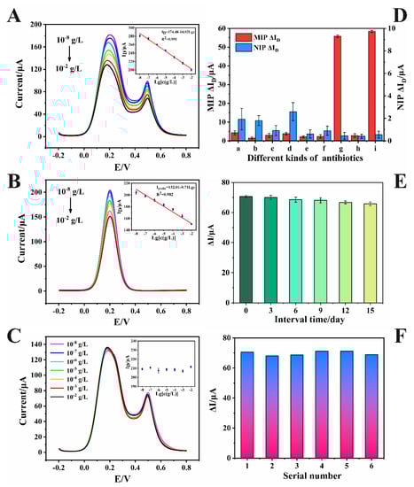 To explore the specificity of the SiO2-COOH@MIPs/SnS2/NiFe-PBA/GCE sensor and the SiO2-COOH@NIPs/SnS2/NiFe-PBA/GCE sensor, this study measured the ΔID value in a mixed solution containing 10−4 g/L CAP and 10−3 g/L of interfering substances. As shown in Figure 5D, the ability of the SiO2-COOH@MIPs to specifically recognize the CAP was not affected by the interfering substances, and the ability of the SiO2-COOH@MIPs to recognize the CAP was much higher than the SiO2-COOH@NIPs.