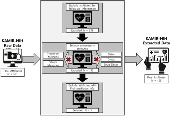 - For the proposed prediction model, the experimental dataset is preprocessed by applying multiple preprocessing, data cleaning, experimental data extraction, and data sampling methods, resulting in 13,104 patients’ records containing 125 important and useful attributes such as basic medical information, past medical history, family medical history, information about medical diagnosis tools, medical findings, PCI information, and initial diagnosis records, and so forth as the final experimental dataset.