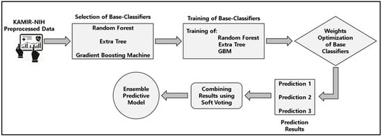 In this section, we describe the framework to propose the machine learning-based soft-voting ensemble classifier for the predictive modeling of our results, such as ACS outcomes and discharge reasons. Basically, the voting ensemble classifier relies on the multiple machine learning-based base classifiers which collectively take part in the final prediction results and finalize the predictive results on the bases of the highest weighted probability result. It combines the multiple machine learning models to increase predictive accuracy and minimize the flaws of individual classifiers. The mathematical equation for the prediction of the soft-voting ensemble classifier is as follows: