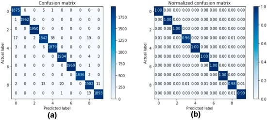 Figure 4a represents the actual confusion matrix with classified class labels and misclassified class labels, whereas Figure 4b represents the normalized confusion matrix. The diagonal values in Figure 4a,b represent the accurately classified results and other values misclassified using the machine learning-based soft-voting ensemble classifier.