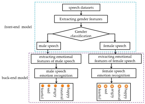 In this section, we establish the overall framework of speech emotion recognition. The overall framework shown in Figure 1 is divided into two models: the front-end model and the back-end model. The front-end model completes gender recognition and the classification of speech data. The back-end model extracts emotional features from the speech data of males and females, respectively, and provides the emotional recognition results of different genders.
