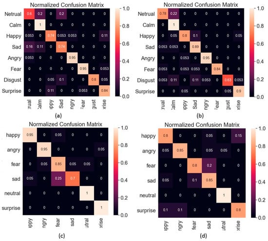 CNN recognition results. (a) Result of male speech in RAVDESS dataset. (b) Result of female speech in RAVDESS dataset. (c) Result of male speech in CASIA dataset. (d) Result of female speech in CASIA dataset.