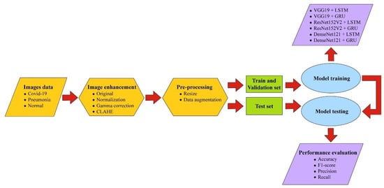 In this study, the CNN was combined with the RNN to improve the classification result because the CNN has high-efficiency characteristics for feature extraction but is unconnected across nodes within the same layer, while the RNN contains a property that analyzes dependencies and continuity from earlier information, which assists in pattern recognition from extracted features. The widely used CNN models VGG19, ResNet152V2, and DenseNet121 were combined with a version of RNN, including LSTM and GRU, to determine which combination of CNN and RNN architecture yielded the best results. There is no report that compares the performance of different CNNs when combined with different RNN versions. In this work, we collected a large dataset of 16,210 X-ray and CT images from various sources with varying image sizes, brightness levels, and viewing angles to use for experimentation, which guaranteed the method’s flexibility to handle input data and high reliability. Further, the image enhancement technique via normalization, gamma correction, and contrast-limited adaptive histogram equalization (CLAHE) was utilized to improve the original image quality. The approach was evaluated on the basis of its accuracy, precision, recall, and F1 score. Figure 1 shows a visual representation of the system’s overall architecture. Before and during enhancement of the image quality, X-ray and CT images of the patients’ lungs were obtained. This allowed us to better evaluate any potential issues with the patients’ respiratory system. The overall size of the images was reduced through pre-processing. Thereafter, the data were separated into two distinct groups: a training set, which was used to instruct the models, and a testing set, which was used to validate the accuracy of the models.