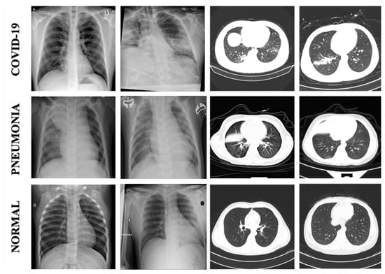 Example X-ray and CT images of COVID-19, Pneumonia, and Normal cases.