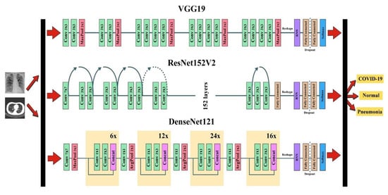 The CNN models were placed first followed by the RNN models to distinguish COVID-19, pneumonia, and normal cases using both chest X-ray and CT images, as shown in Figure 4. Three CNN models (VGG19, ResNet152V2, and DenseNet121) were used to extract the important features. To reshape the CNN output to the RNN (LSTM and GRU) input, we reshaped the output of VGG19 (none, 7, 7, and 512), ResNet152V2 (none, 7, 7, and 2048), and DenseNet121 (none, 7, 7, and 1024) to (49, 512), (49, 2048), and (49, 1024), respectively [11]. In the fully connected layer, the dropout technique was used to avoid overfitting in the networks [30,31]. The final step was the application of the softmax function—the mathematical function used to calculate the probability of lung disease.