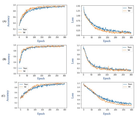 Figure 5 depicts the overall suggested performance during the training and validation phases in terms of accuracy and loss. At epoch 300, the performance parameters of the ResNet152V2 with GRU model utilizing the original images were as follows: training accuracy, 94.92%; validation accuracy, 95.70%; training loss, 0.15%; and validation loss, 0.09%. Similarly, the VGG19 with LSTM model utilizing the normalized images achieved 96.09% accuracy during training, 95.31% accuracy during validation, 0.1 training loss, and 0.11 validation loss. The DenseNet121 with LSTM models utilizing the normalized images attained 91.8% training accuracy, 96.4% validation accuracy, 0.26 training loss, and 0.15 validation loss.