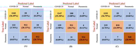 Confusion matrix of the best-performing methods: (A) ResNet152V2 with GRU in original image, (B) VGG19 with LSTM in normalized image technique and (C) DenseNet121 with LSTM in normalized image technique.