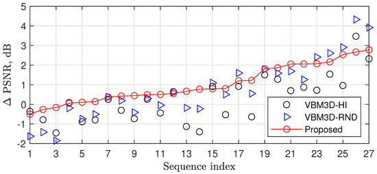 Table 6 shows the BD-PSNR [37] provided by the CS-JPEG codec in comparison with the intra codecs mentioned above. Here, the positive values mean that CS-JPEG provided better performance. One can see that if the temporal similarity level dB, then in the most of the cases, CS-JPEG outperformed the competitors, including x264-veryslow and MJPEG2000. If dB, then the temporal similarity was too low, so the traditional block-based or wavelet-based intra-coding had more advantages. Using this observation, we can conclude that CS-JPEG is more attractive for applications with low and medium motion levels between neighboring frames.