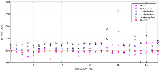 where is the number of bits after compression of frame with a quality factor . The rate control (Equation (18)) selects , depending on the virtual buffer fullness , so that a decrease in leads to an increase in the quality factor and vice versa. As a result, a bit rate close to the target one is provided. Similar rate controls are used in both x264 and x265. However, as can be seen in Figure 8, in many cases, the virtual buffer cannot guarantee a bit rate close enough to the target value . MJPEG, x264, and x265 can provide a bit rate which is up to , , and higher than , respectively. This can be very critical for some video streaming applications. In contrast, both MJPEG2000 and the proposed rate control for CS-JPEG provided almost exact for all the considered test video sequences. Here, the proposed rate control had a higher precision than that in MJPEG2000.