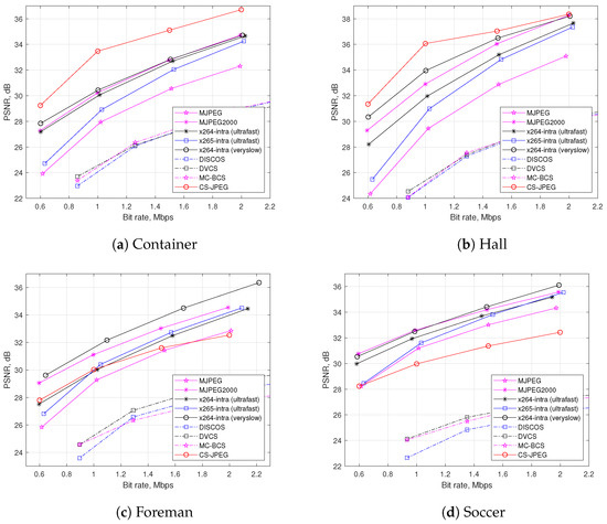 As a reference, Figure 9 also shows the rate distortion performance for other codecs based on CS such as DISCOS, DCVS, and MC-BCS. One can see that the proposed CS-JPEG provided significantly better results. Therefore, we further compared CS-JPEG only with the block-based codecs, such as x264, x265, MJPEG, and wavelet-based MJPEG2000. Finally, x265-intra (ultrafast) provided surprisingly worse compression performance than x264-ultrafast. This could be explained by H.265/HEVC originally being oriented for video sequences with higher frame resolutions. In order to demonstrate this, Figure 10 presents comparisons for two test video sequences [21] with a frame resolution of . For such a resolution, x265-intra (ultrafast) provided much better performance than both x264-intra (ultrafast) and x264-intra (veryslow).