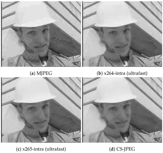 Figure 11, Figure 12, Figure 13 and Figure 14 show frame 150 for `Container’, `Hall’, `Foreman’, and `Soccer’ at a target bit rate kbps. It could be noticed that MJPEG, x264, and x265 produced very strong blocking artifacts, while CS-JPEG was free of them.