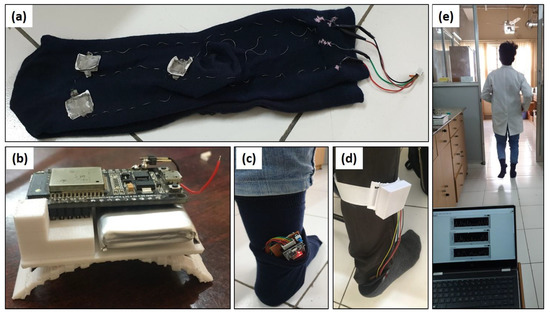(a) The three SF-based sensors with CNF stitched in the socks by means of conducting thread; (b) Electronic controller unit; (c) Electronic controller unit connected with sensors; (d) Electronic controller unit covered with the 3D printed case; (e) Sensors testing with a volunteer and LabVIEW software [Video S1: movement analyses].