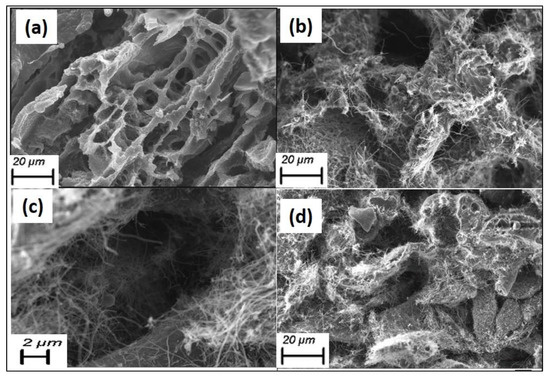 Morphological analysis of the SF and SF with CNF samples at (a) SF at 20 µm resolution; (b) SF with CNF density equal to 0.3%; (c) high magnification of SF with CNF density equal to 0.4% at 2 µm resolution; (d) SF with CNF density equal to 0.5% at 20 µm resolution.