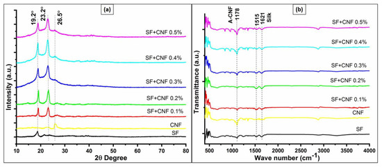 Crystal analysis of the SF sample and the SF sample with CNF nanocomposites in terms of: (a) XRD analyses; and (b) FTIR analysis.