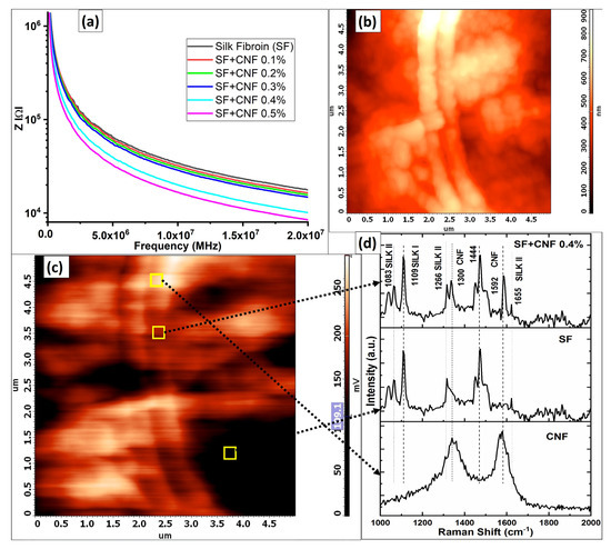 (a) Impedance vs. frequency graph for the SF sample having different CNF concentrations; (b) the AFM image of SF with CNFs network; (c) AFM image of SF with CNFs magnified in areas of conducting based on CNFs stacking; and (d) Raman analysis which represents a comparison of different elements of the AFM image for the pure CNFs, the pure SF and nanocomposite containing SF with CNFs density equal to 0.4%.