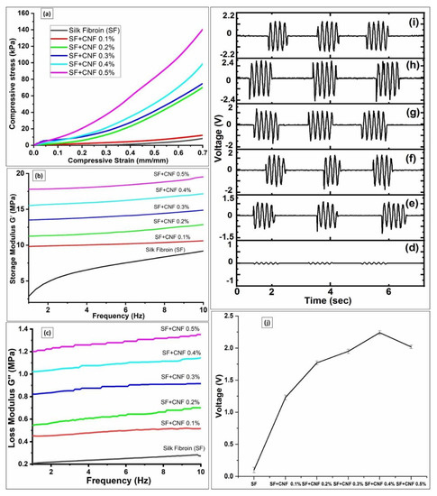 (a) Stress vs. strain analyses for SF samples with different CNF concentrations; (b) Storage modules vs. frequency analysis for the SF samples with different CNF concentrations; (c) Loss modulus vs. frequency analyses for SF samples with different CNF concentrations; Piezoelectric voltage generated for the samples composed of: (d) the pure SF, (e) the SF with CNFs density equal to 0.1%; (f) the SF with CNFs density equal to 0.2%; (g) the SF with CNFs density equal to 0.3%; (h) the SF with CNFs density equal to 0.4%; (i) the SF with CNFs density equal to 0.5%; (j) Peak average values of generated piezoelectric voltage for SF samples with different CNF concentrations.