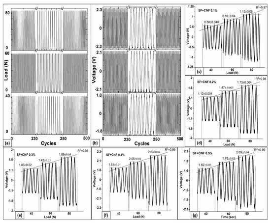 Table 2 summarizes the voltage response at three different load levels (equal to 40 N, 60 N and 80 N) for 500 compression test cycles, and indicates results obtained for the compression recovery of the material after load tests performed for load equal to 80 N. According to the results presented in Table 2, the pure SF did not show a significant piezoelectric voltage response (0.1 ± 0.01 V) for all three loading compressions. Although studies with pure SF show the existence of piezoelectric responses due to the processing techniques related to the improvement of Silk II content and their alignments [22], in this study neither of such techniques has been adopted. This is because the goal of this study was to precisely assesses the influence of the CNF on SF-based sensor piezoelectricity and implementation of any of such processing techniques will influence SF piezoelectricity response. However, according to the results presented in Figure 7c–g, for SF with different CNF densities (ranging from 0.1% to 0.5%) a significant change in piezoelectric voltage is generated for every one of the analyzed load levels. In addition, according to results presented in Figure 7c–g, the increase in the CNF in the SF structure up to 0.4% of CNF density improves the level of piezoelectric voltage response as well as mechanical properties, which according to Table 2 exhibit high load recovery.