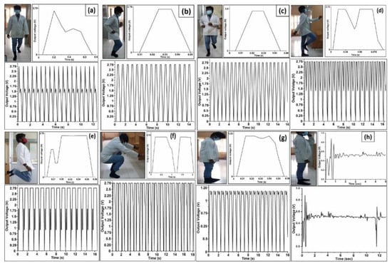 The piezoelectric voltage response of the SF-based sensor with CNF densities equal to 0.4%, analyzed for various human motions which include: (a) walking; (b) jogging; (c) running; (d) marching; (e) jumping; (f) squatting; (g) tapping and (h) standing [Video S1: movement analyses].