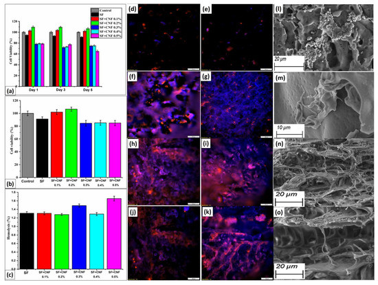 (a) Percentage of skin cells viability for samples with different CNF densities in the SF; (b) Percentage of blood cells viability for samples with different CNF densities in the SF; (c) Percentage of hemolysis for samples with different CNF densities in the SF; Cytotoxicity studies of: (d) the pure SF; (e) the SF with CNF density equal to 0.1%; (f) the SF with CNF density equal to 0.2%; (g) the SF with CNF density equal to 0.3%; (h) the SF with CNF density equal to 0.4%; (i) the SF with CNF density equal to 0.5%; (j) the untapped SF with CNF density equal to 0.4%; (k) the tapped SF with CNF density equal to 0.4%; (l) untapped pure SF sample with cells; (m) tapped pure SF sample with cells; (n) untapped SF with 0.4% sample with cells; and (o) tapped SF with 0.4% sample with cells.