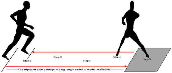 The participants performed a shuttle-run task while wearing three different types of socks (US, SS, and NS). Each participant had a 10-min preparation session, including a warm-up and practice for a shuttle-run task to improve task familiarity. The shuttle-run task was initiated by making four steps in the forward direction, followed by a change of the movement direction to the opposite direction (180°) at the force platform and steps back to the starting point (Figure 2). Before each shuttle-run trial, standardized instruction was provided. They placed their feet before the starting point. Then, they initiated the task with a verbal sign (‘Go’) by running on the path of the red line, followed by placing their right foot at the right angle to the red line at the transition, and coming back to the starting position. They were instructed to complete the task as soon as possible. The distance between the starting and turning points was adjusted to the triple of each participant’s leg length (ASIS to medial malleolus). The participants performed five shuttle-run trials per each sock type, interspersed with a 2-min break to minimize fatigue.