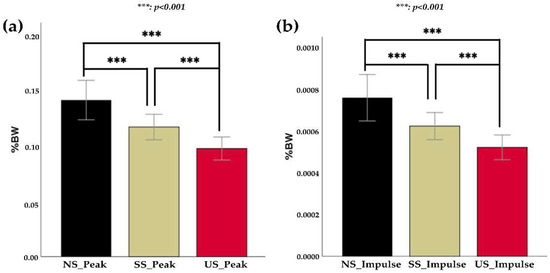 Comparison of peak and impulse values between socks. (a) Peak values (mean ± std) measured with three different socks (NS: normal socks, SS: silicone socks, and US: urethane socks) (b) Impulse values (mean ± std) measured with three different socks. Significant level: *** p < 0.001.