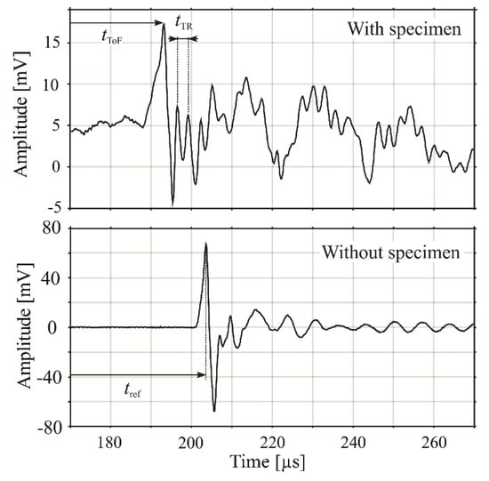 Representative signals for the proposed technique. The upper and lower graphs show a measured signal with and without a specimen, respectively. The times and are independent parameters, which enable the discrimination between the influence of the plate thickness and the material properties. An initial measurement of the time of flight between the transducers () enables the determination of absolute values for both parameters simultaneously. The observable signal oscillations after the pulse detection feature components other than only the in-plate reflections and are further analyzed in the signal measurement and processing section.