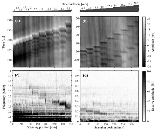 B-scans for thinner (a) and thicker (b) plate thickness ranges. The signals in frequency domain are shown in S-scans (B-scans in frequency domain) for the same positions of both linear scans in (c,d). The TR frequency is inversely proportional to the plate thickness, while the ToF is linearly proportional to the plate thickness.
