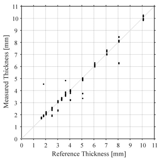 In Figure 4, we present the plate thicknesses obtained by inserting and in Equations (3) and (4). The only parameter in this equation that was not measured directly by our experiment is sound velocity in air which proportionally influences all the measurement points and amounted to 345.7 m/s in our experiment. The thicknesses measured by our ACU method are compared to values obtained by the reference measurement with a micrometer screw (precision higher than 0.01 mm). In Table 1, statistical values are provided for each of the plate thicknesses: mean value of the air-coupled measurement, its standard deviation, number of measurements at each of the plate thicknesses (obtained by the linear scan), and the number of the outliers, which we excluded to calculate the standard deviation. We did not exclude any values in Figure 4.