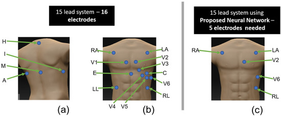 Comparison of electrode placement needed for a 15-lead system and the proposed method. For 15-lead system (a) electrode placements on the ventral side (b) electrode placements on the dorsal side. For the proposed method (c) electrode placements only on the ventral side [7,23].