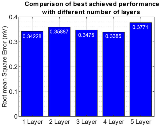 We observed that the 4-layer network had the lowest test set RMSE value (0.3385 mV). The difference between the best and worst RMSE is ~40 µV. The hyperparameters associated with the optimal model are in Table 4.