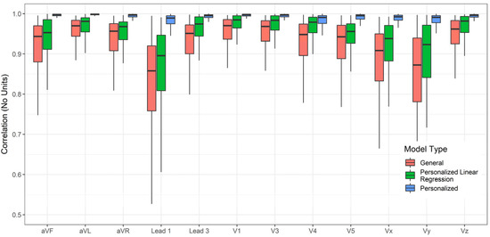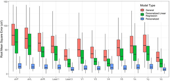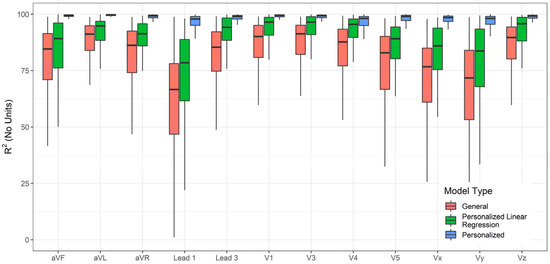 The accuracy of lead transformations to Frank XYZ could be compared to several results reported in the literature (Figures S12–S14 in the Supplementary Material). However, the accuracy of conversion to all leads other than the inputs (Lead II, V2, and V6) is a novel exploration in this work. In addition to the personalized and general models, linear regression transformations for personalized data were also determined, and their performance was charted for comparison. The linear transformations were computed using Q.R. factorization [48]. Figure 4, Figure 5 and Figure 6 compare the RMSE, R2, and Pearson Correlation Coefficient values for all the derived leads of ECG between the generalized model, the personalized model, and linear regression applied to the personalized models. The boxplots present the median values, lower and upper quartiles, and the minimum and maximum values. The Supplementary Information provides the mean and standard deviation of RMSE, R2, and ρ for the general, personalized linear regression and personalized models.