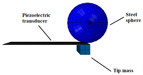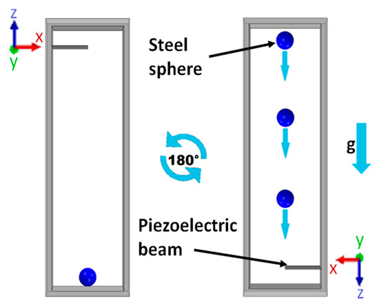 The object of the study is referred to in a finite volume of 22 mm × 6 mm × 1.8 mm, which is suitable for a wearable device. The considered volume contains a piezoelectric beam, representing the energy transducer for the conversion of mechanical energy into an electrical one. The considered scenario exploits the free fall of an impact mass on the free edge of a piezoelectric beam. The working principle, depicted in Figure 1, concerns the power production of the considered piezoelectric cantilever beam impacted by a steel sphere with a mass of 110 mg, which is free to move along a rectilinear path under a uniform acceleration of 1 g. As shown in Figure 1, the sphere movement is activated by the action of gravity after a rotation of 180° around the y-axis. This simple device exploits the impact mechanism of the free steel ball on the transducer. The analysis allows the possibility to have multiple impacts on the cantilever. For the sake of simplicity, the rotation must be thought to be instantaneous. In the considered conditions, the impact velocity is equal to 0.533 m/s and computed considering the steel sphere travelling a distance of 14.5 mm inside the available volume.