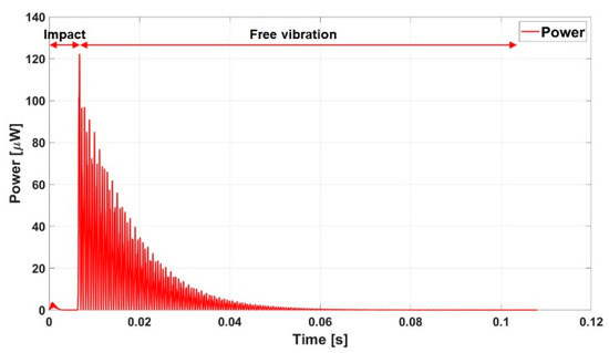 The graph in Figure 3 shows the electric instantaneous power vs. time plot, namely the impact of a steel sphere, as shown in Figure 1. The time is set to zero at the moment of the impact of the sphere on the beam tip. In the subsequent time instants, the kinetic energy of the sphere is transformed into the strain energy of the beam, which attains the maximum deformation at about 4.5 ms. In this time interval, tiny energy production is observed, with a maximum of about 2 ms. The sphere leaves the beam at about 7 ms, and the free oscillation of the cantilever begins thereof, with the typical decay in agreement with the chosen quality factor. The peak power estimated as V2/Ropt was about 120 μW.