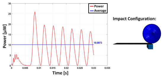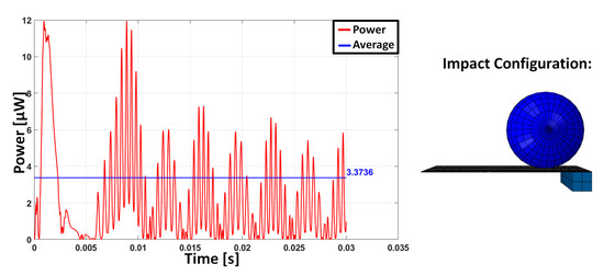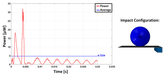 The sphere spends 54 ms to cover its rectilinear path. Taking into account the inverse path, the subsequent impact may occur after 108 ms. The analysis reported in Figure 3 confirms that the free vibration is completely damped out at that time. Thus, integrating the instantaneous power, the energy on the time interval between two subsequent impacts is 0.550 μJ. Almost 10 impacts may happen in one second so that the cumulated energy might reach about 5 μJ.