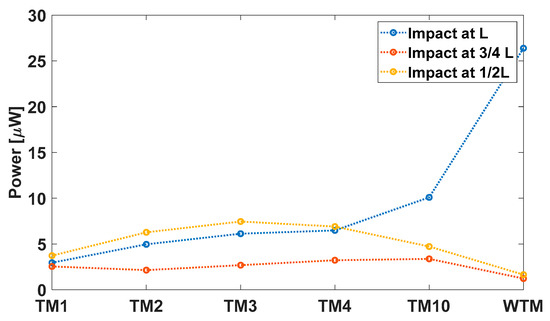 The impact at the midpoint of the beam length shows a non-monotonic power generation again in view of the presence of multiple impacts: as far as the tip mass is low (or absent), the beam rebounds promptly, and the sphere is hit again. For intermediate tip masses (i.e., TM2-TM3-TM4-TM10), the second impact does not happen, and the power generation is satisfactory through a combination of the first and the second bending modes. Finally, for big masses, the same trend as for the tip impact is recovered.