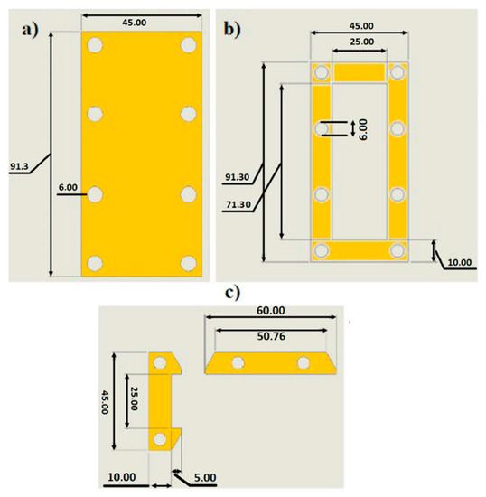 The entire mechanical frame of the prototype was first designed with SolidWorks© software and then a built-in laboratory. The construction operations were carried out starting from 1.7 mm thick FR4 plates, which were then cut with a numerical control pantograph (CNC procedure) according to the design. The frame is basically composed of three parts: the base, collar, and anchors, as illustrated in Figure 10. The components of the frame are assembled in the order (a), (b), and (c) of Figure 10 from the bottom to the top. The anchors create a proper zone to guarantee the clamp boundary condition for the cantilever.