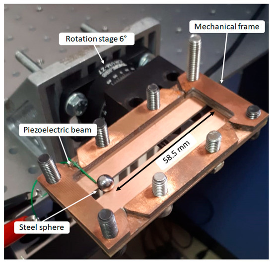 The prototype is composed of a mechanical frame, a steel sphere, and the mentioned piezoelectric beam. The sphere has a diameter of 7 mm and a weight of 1.4 g.