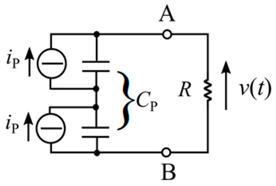 The acquisition of the output voltage generated by the cantilever is made with the Keysight MSOX3014A oscilloscope. Voltage measurements are taken across an optimal resistance load of Ropt = 85 in parallel with a resistance of Rosc = 1 introduced by the oscilloscope. The value of Cp is equal to 770 pF, as computed through Equation (7) by summing the contributions of two piezoelectric layers. In Figure 12, the electrical model of the piezoelectric beam is presented.