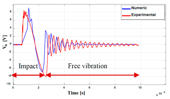 Comparing the numerical and experimental results, it is possible to deduce that the numerical model gives a good estimation of the coupled electromechanical behaviour of the beam during an impact. Figure 14 shows the numerical and experimental voltages as a function of time.