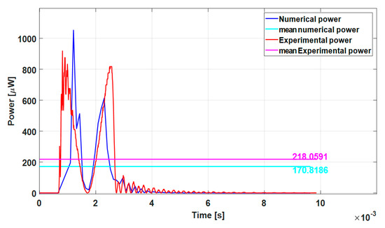 Figure 15 shows the comparison between the experimental (red line) and the numerical (blue line) results in terms of the output power. Though a mismatch is visible in the impact phase, for the same reasons commented above, there is a satisfactory agreement in the free vibration. In conclusion, it is possible to state that the numerical models capture the physical phenomenon of interest with a good approximation.