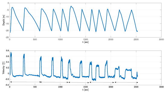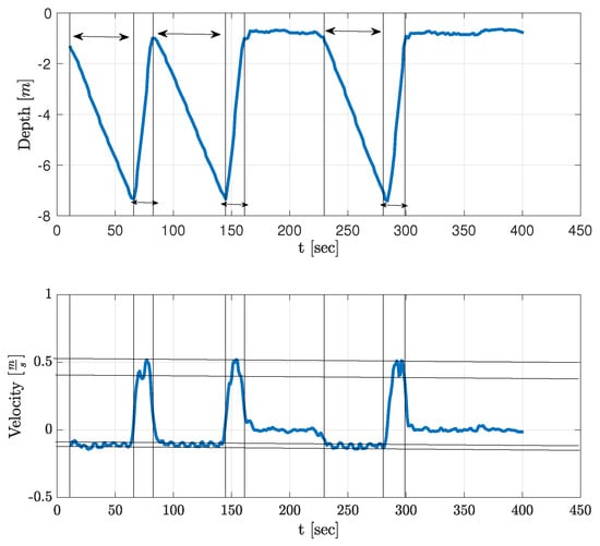 The outcome of the two experiments was a measure of the relation between the floaters’ measured velocity at steady state, , and the measured mass of their plumbum weights, . To that end, the floaters’ initial buoyancy, i.e., before adding weights, was made negative, causing the floater to sink with no thruster force—that is, . The offline analysis included averaging the five ascend–descend profiles to yield the average steady-state ascend and descend speed.