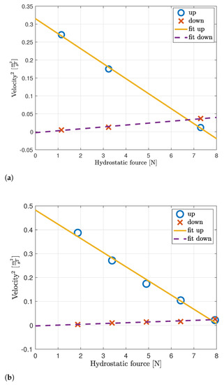 By (6) and (10), the relation between the velocity and the weights’ mass is quadratic. To parametrize this relation and to extract the drag force, we performed a linear regression over the measured square velocity and the weights’ mass. The results of this linear fitting for the Haifa trial, along with the averaged measurements, are shown in Figure 5a. We observe a good fit between the measured relation and the linear fitting from which the following parameters are drawn: kg/m, kg/m, N, N. The results for the Eilat trial are given in Figure 5b. These results also show a good fit for the linearization attempt, and the following parameters are drawn: kg/m, kg/m, N, N.