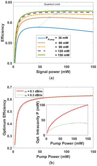Using Equations (7)–(10) for a given pump power, by changing the signal power, a maximum intra-cavity signal power can be determined leading to find the efficiency, i.e., signal-to-pump power ratio [31]. For different pump powers, the efficiencies are calculated and shown in Figure 2a. For a typical background loss of 0.1 dB/m, the maximum ratio is always less than the quantum efficiency limit. From each peak in Figure 2a shown by circles, the maximum efficiency and optimum intra-cavity signal power for each pump power can be found. Consequently, the maximum efficiency and optimum intra-cavity signal power versus pump powers up to 150 mW have been depicted in Figure 2b for a background loss of 0.1 and 0.3 dB/m.