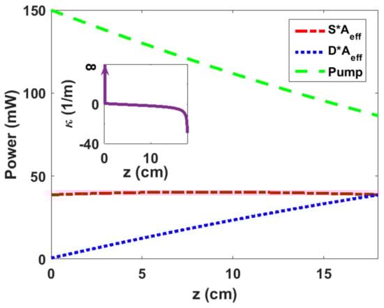 The exponentially increasing signal, , encounters the optimum value for the signal power of 39.4 mW at the PPS position of 1.9 cm, and from this location, the signal power distribution is assumed to follow the optimum value. With the increase in the signal power, we calculate the pump power and D parameter distribution starting from 150 mW. Knowing the optimum signal power for each pump power (see Figure 2b), the optimum signal distribution corresponding to this pump distribution can be obtained.