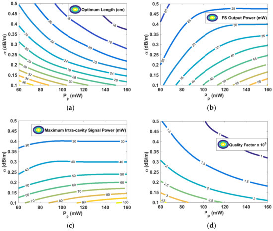 Contour maps for (a) optimum cavity length, (b) maximum FS output power, (c) maximum intra-cavity signal power, and (d) quality factor, considering various pump power and fiber background loss.