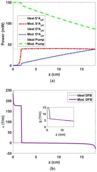 Figure 5a shows ideal and modified curves for Pp, S, and D as a function of EDF-DFB length. The exponential parts of the curves before the PPS (z = 1.9 cm) in Figure 5a depict the described modifications. With the aforementioned parameters we use Equations (5) and (6) to re-calculate and up to the PPS position at z = 1.9 cm. Consequently, the modified DFB’s coupling-coefficient profile is shown in Figure 5b.